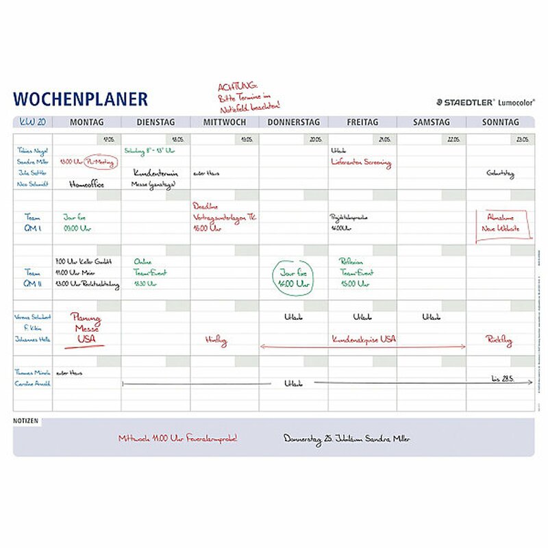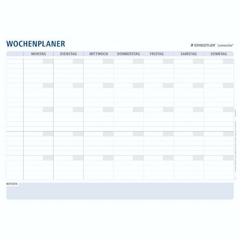 Dieser Wochenplaner von Staedtler 641 A1-1 Lumocolor im Format DIN A1 ist nass und trocken abwischbar und mit zwei Lumocolor correctable 305 M Stiften in rot und schwarz sowie zwei selbstklebenden Stiftehaltern- Selbsthaftend auf allen trockenen und glatten Oberflächen