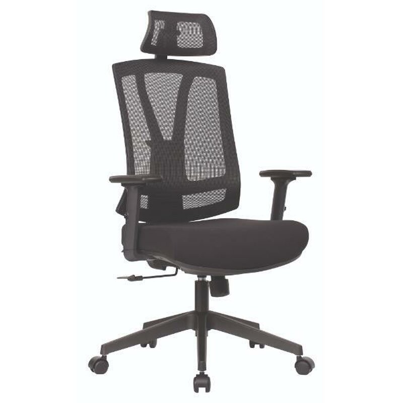 ORION I Bürostuhl in schwarz, Synchronmechanik, Stoffsitz, Netzrücken, höhenverstellbar, Lendenwirbelstütze, mit 2D-Armlehnen, optionale Kopfstütze, 8 Std