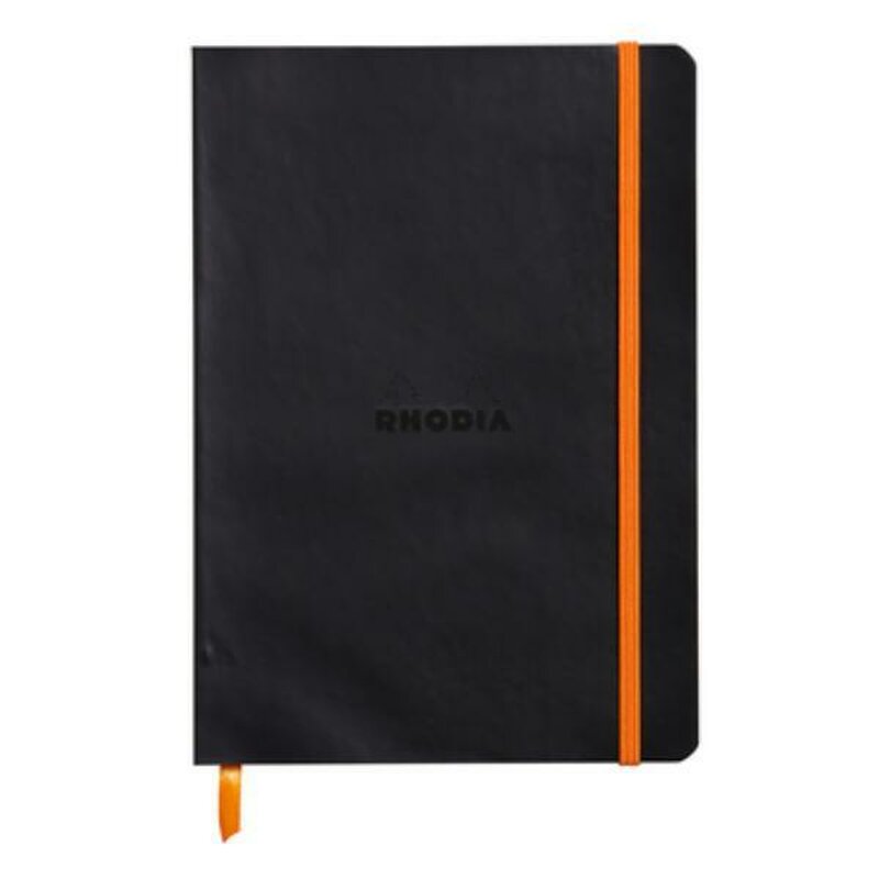Wie soll man auch dem Charme des samtweichen Einbandes und der Authentizität der Fadenbindung der flexiblen Notizbücher Rhodiarama widerstehen können! Flexibler Einband aus italienischem Kunstleder, mit geprägtem Rhodia-Logo und orangefarbenem Gummizugverschluss- Mit orangefarbenem Lesezeichen, dehnbarer Innentasche in orange