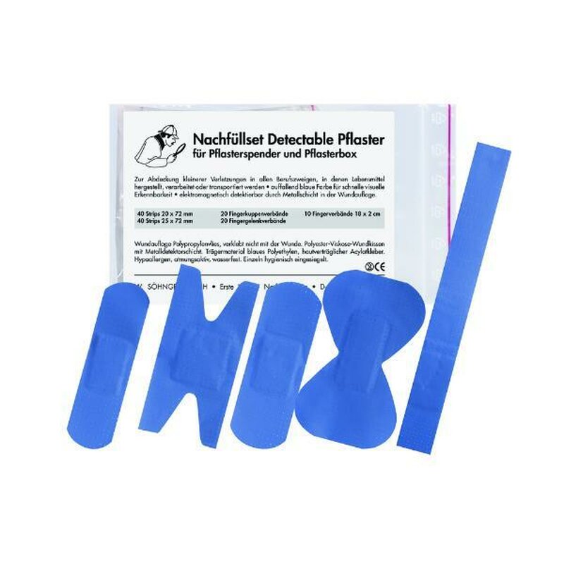 Nachfüllset mit 130 auffallend blauen detectablen Pflasterwundverbänden in fünf verschiedenen Abmessungen und Zuschnitten (Strips in zwei Größen, Fingerverbände, Fingergelenk- und Fingerkuppenverbände) sowie ein Miniblock Notfallversorgungsnachweis.| Farbe: | blau |